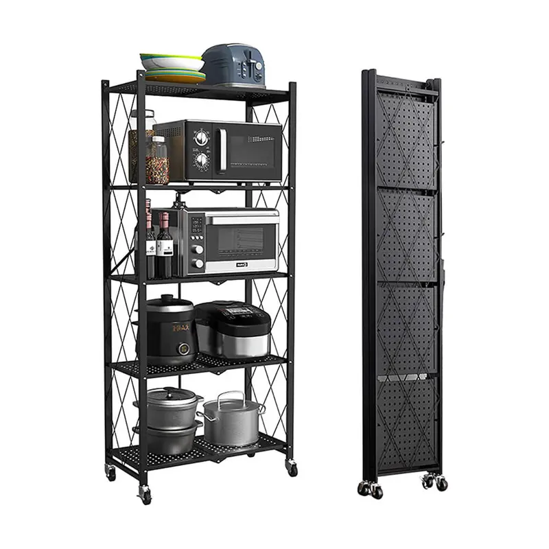 The 5-Tier Foldable Metal Rack Storage Shelving Unit with Wheels is a multi-purpose storage and organization rack. This home shelf is suitable as a living room decor organiser, kitchen shelf or even for arranging flowers and plants in the patio. When shopping for storage shelves for your bbedroom or for you a shelf for your microwave oven, look no further.
